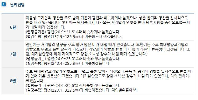 장마이후 본격적인 더위가 시작되니 7월초중순부터 엄청나게 더워질것을 예상해봅니다. 저는 장마를 피해 7월말 즈음에 휴가 계획을 세우고 있는데요. 장마 끝나고 바로 다녀오는 것이 안전할 것 같습니다.